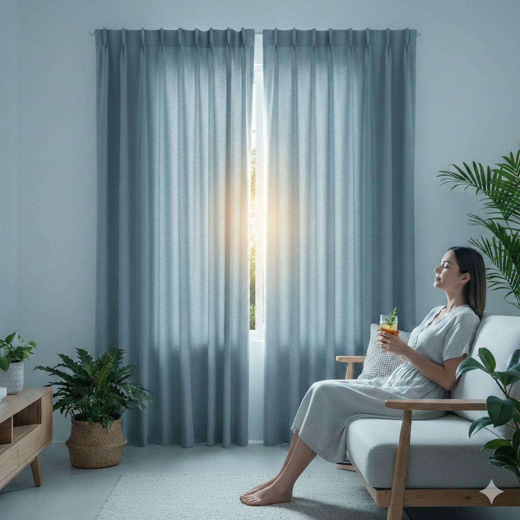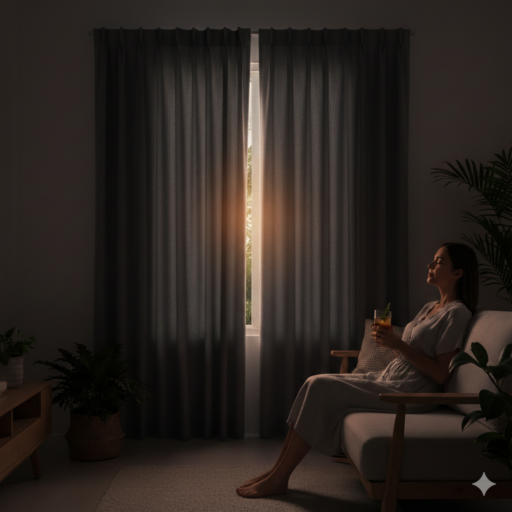 - ข้อควรระวัง: แม้จะกันแสงได้ดี แต่สีเข้มจะ “ดูดซับความร้อน” ไว้ที่ตัวผ้า หากเลือกผ้าที่ไม่มีชั้นสะท้อนความร้อนด้านหลัง อาจทำให้บริเวณหน้าต่างมีความร้อนสะสมสูง ควรเว้นระยะห่างระหว่างม่านกับกระจกประมาณ 10-15 ซม. เพื่อให้ลมหมุนเวียนได้