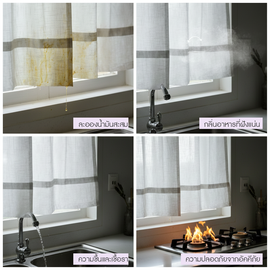 ก่อนจะตัดสินใจซื้อ เรามาทำความเข้าใจ 4 ปัจจัยเสี่ยงที่ ม่านห้องครัว ต้องเจอในทุกๆ วัน เพื่อให้คุณเลือกวัสดุที่คุ้มค่าที่สุด: